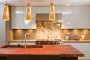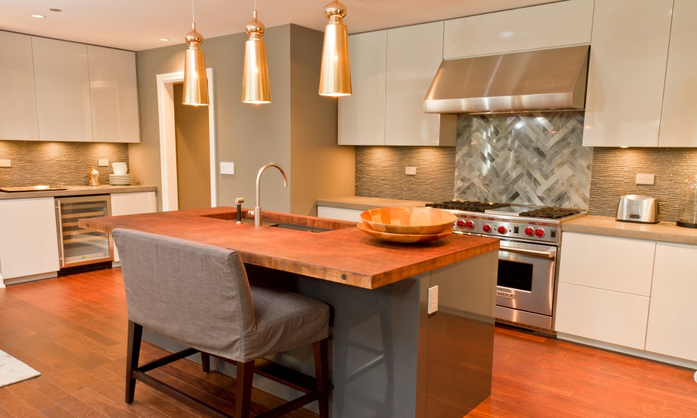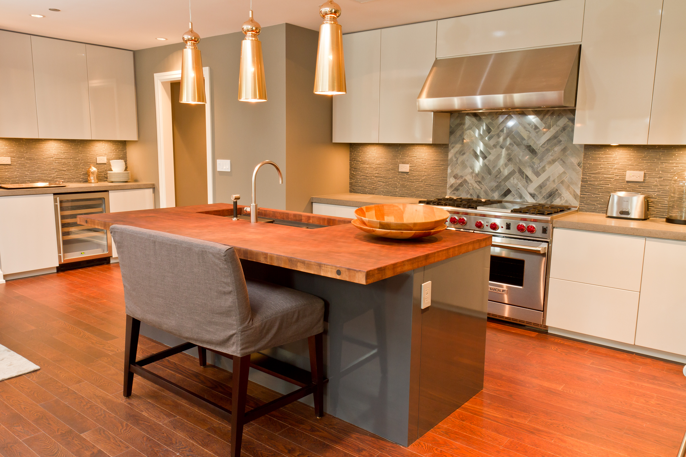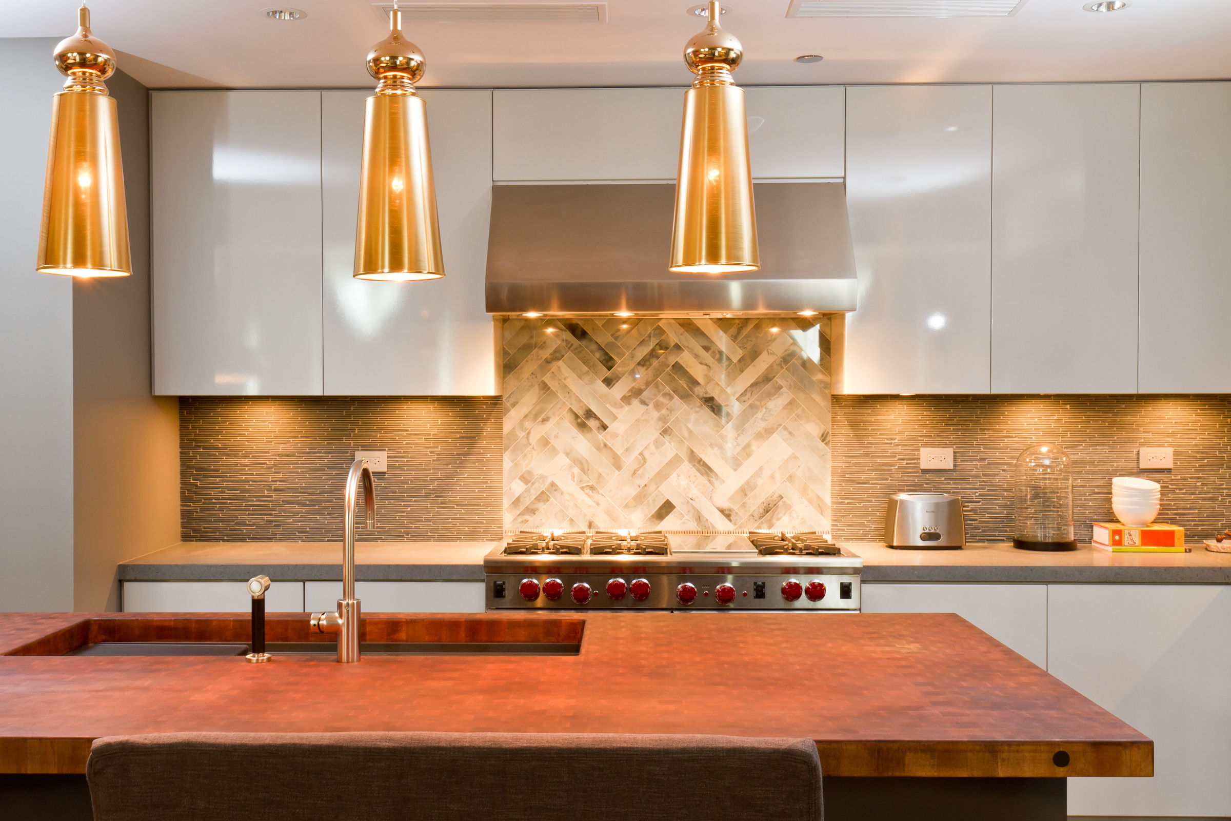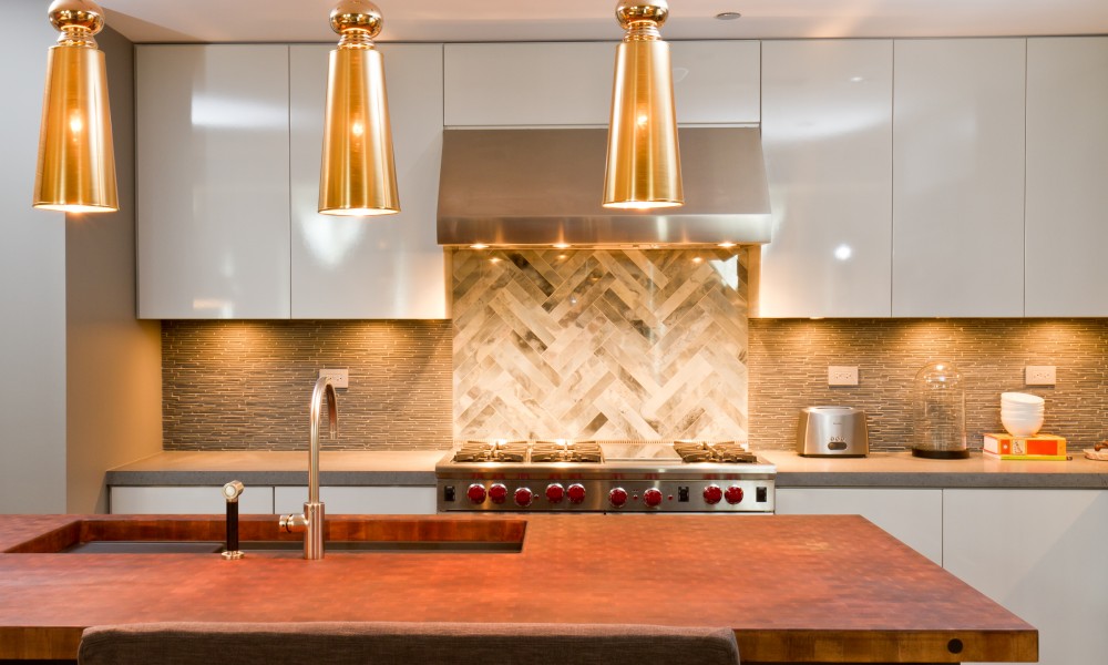 The updated kitchen combines a unique, modern look with the comfortable feel a home provides. A brown end grain island butcher block top accents the surrounding lacquer millwork cabinetry. New stone countertops intersect a challenging tile backsplash design, which incorporates many different colors, patterns, and textures.