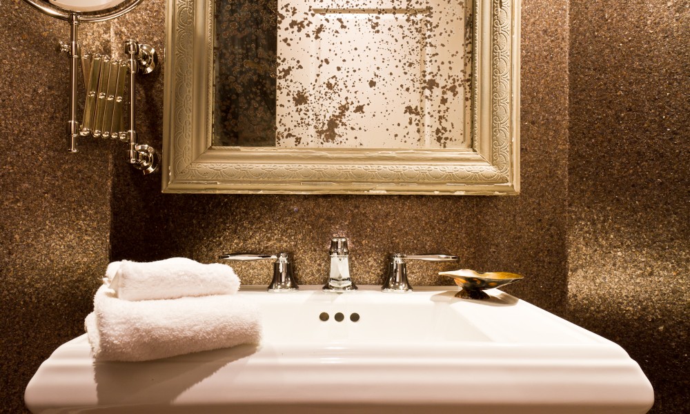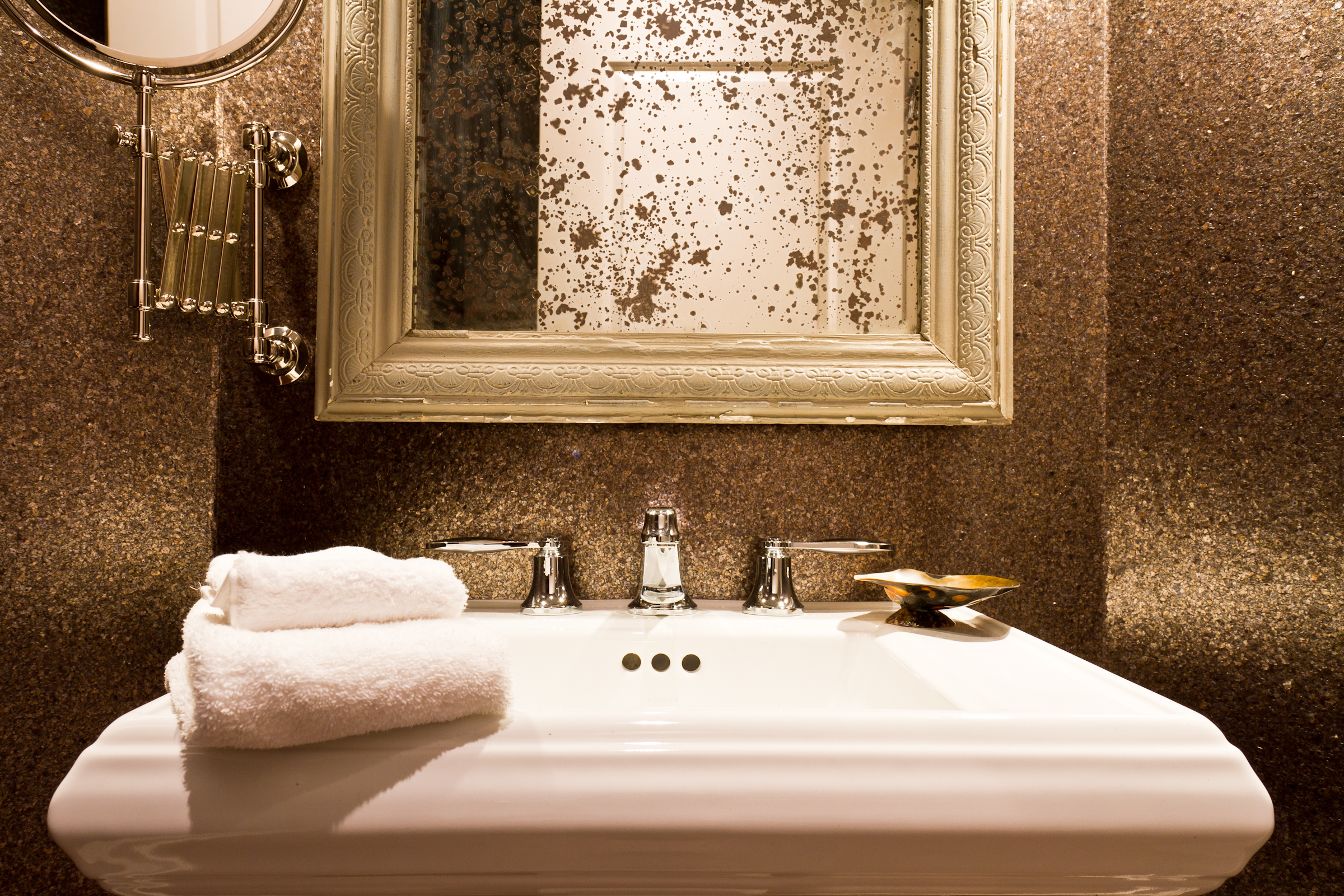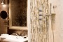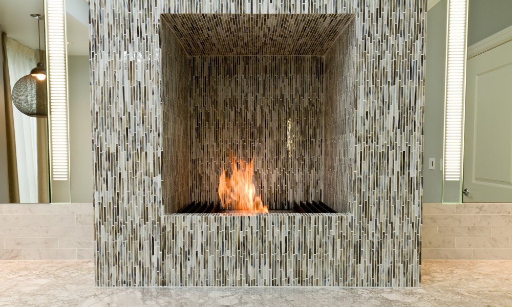 The newly designed master suite incorporates his and hers walk in closets along the way to the master bath oasis, boasting a flare for the dramatic architecture and innovation behind every corner. Simple yet elegant lines are apparent in the tile and stone layout which seamlessly incorporates several distinctive materials. These lines are carried through the glass mosaic tiled fireplace, resting on top of a walnut vanity and surrounded by glass sconces and recessed medicine cabinets. A shower enclosure with custom niches, glass mosaic tiles, and a floating stone bench accents the new fixtures which are centered on an intricate tile pattern. Architectural design meets cutting edge technology by utilizing floor heat, LED lighting, and vanishing TV’s throughout.