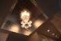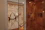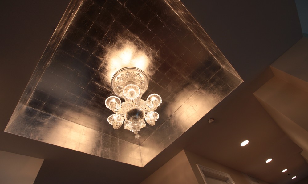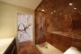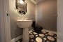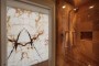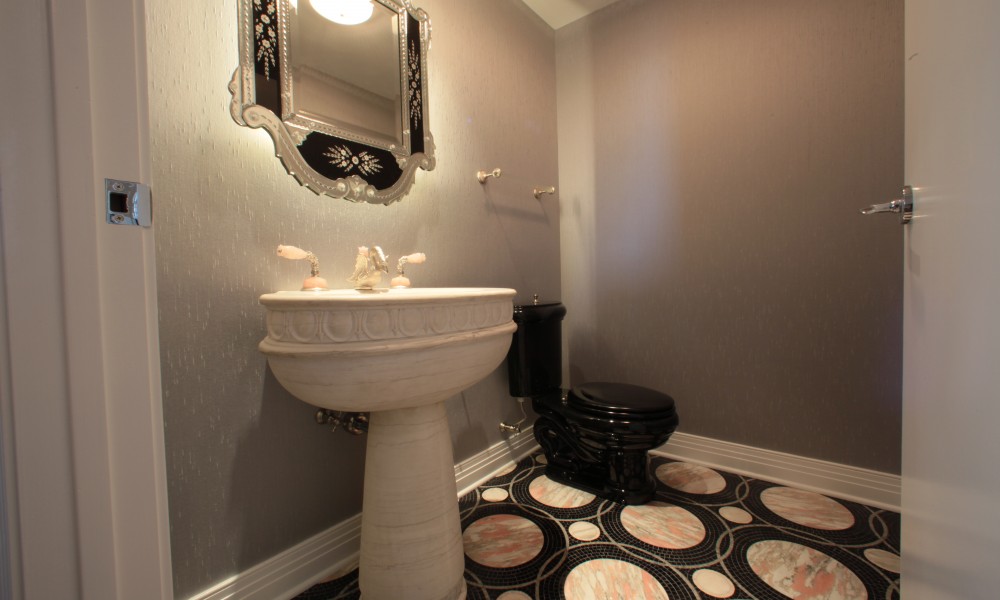Taking cues from the design elements in the Master Bath Suite, the ambiance in the Powder Room was transformed to include beauty and creative details. The stand-out feature in the room is a hand-carved onyx sink and a brushed nickel swan faucet. Additional elements include a custom patterned mosaic stone floor and silk covered walls. The back-lit mirrors are the perfect touch in the fashionable setting.