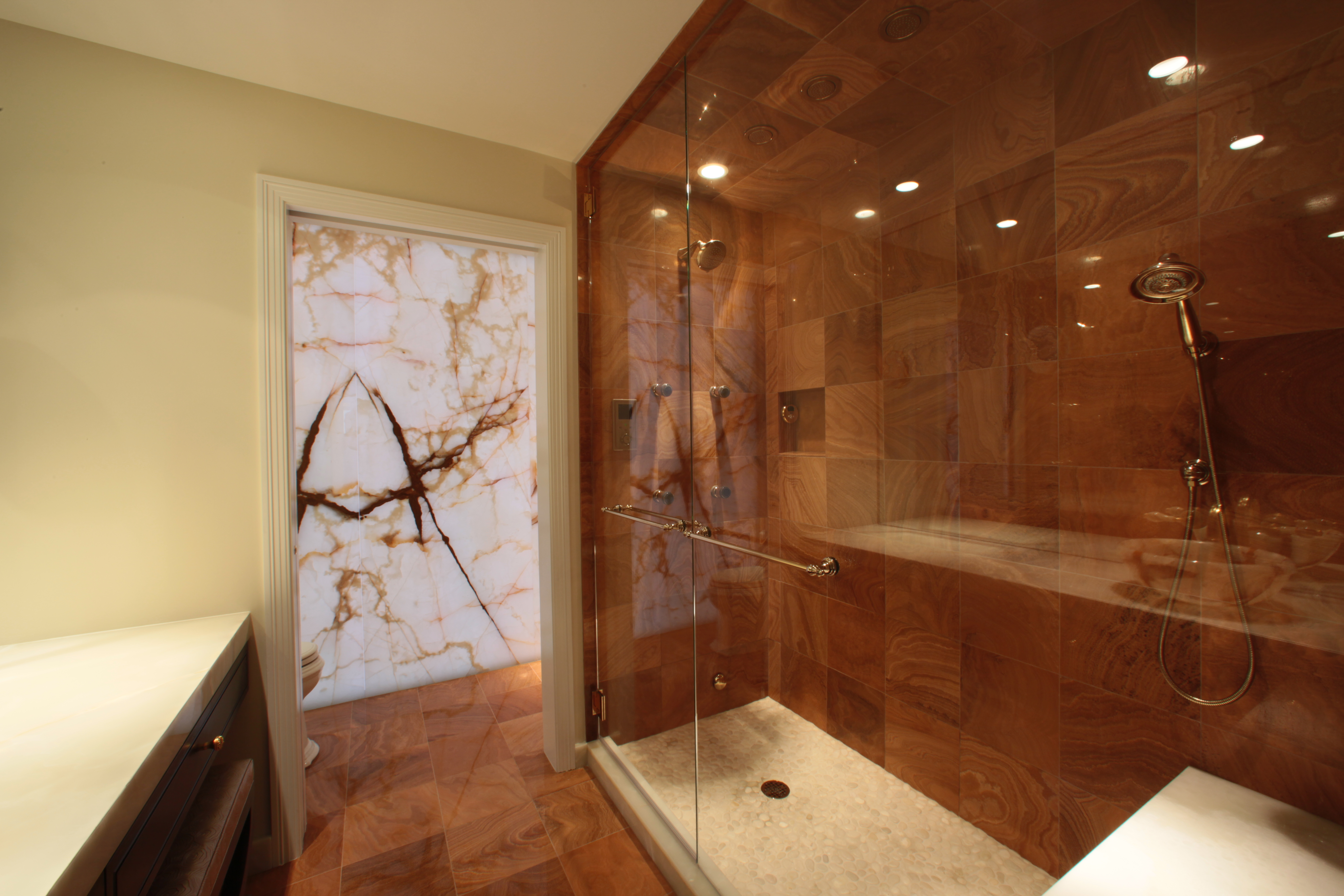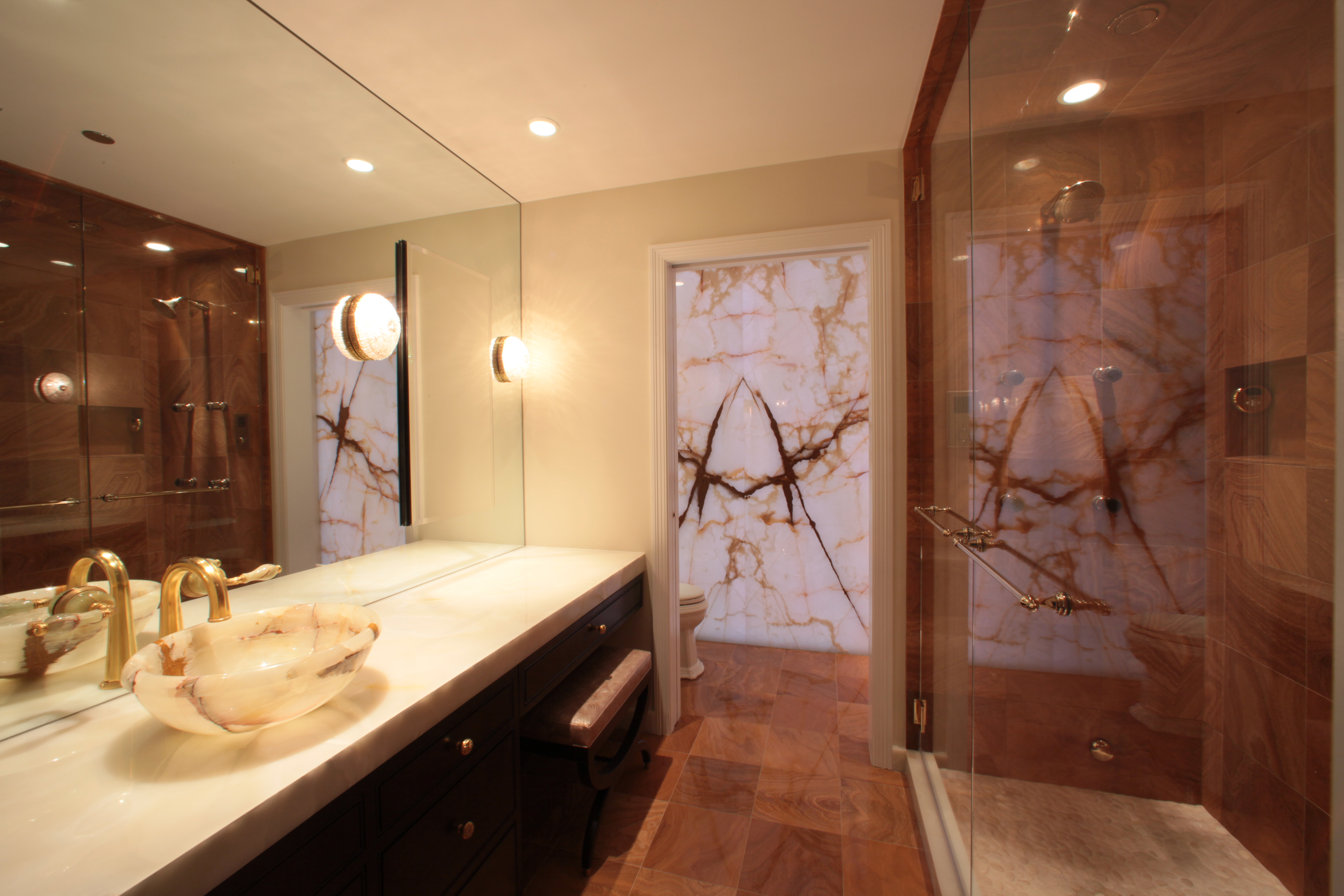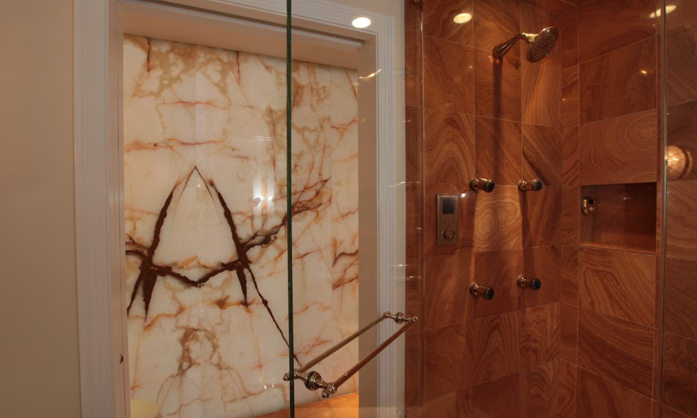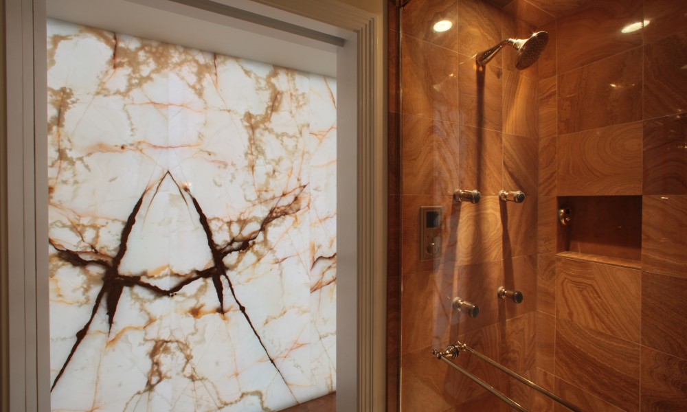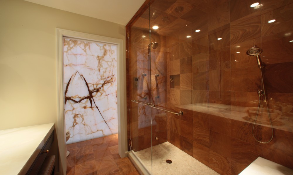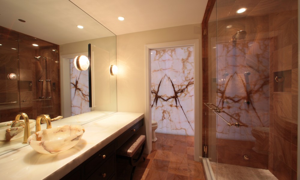 The Master Bath Suite was reconfigured to include a water closet for a toilet, bidet and a state-of-the-art Kohler DTV shower system with rain heads, body sprays and steam with custom-mounted controls. Incorporating an innovative lighting solution, the new suite is highlighted by a custom-designed back-lit green onyx wall.