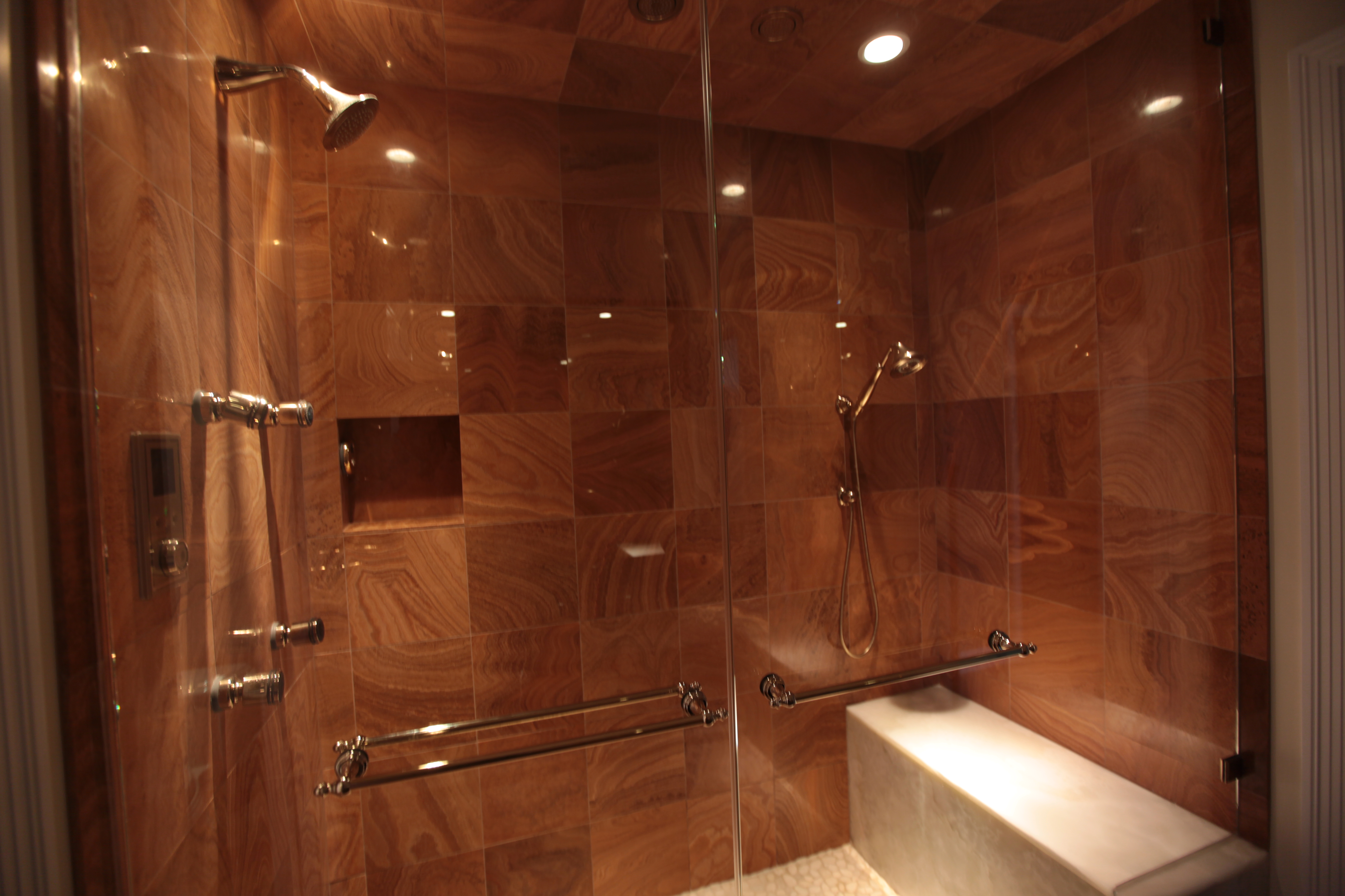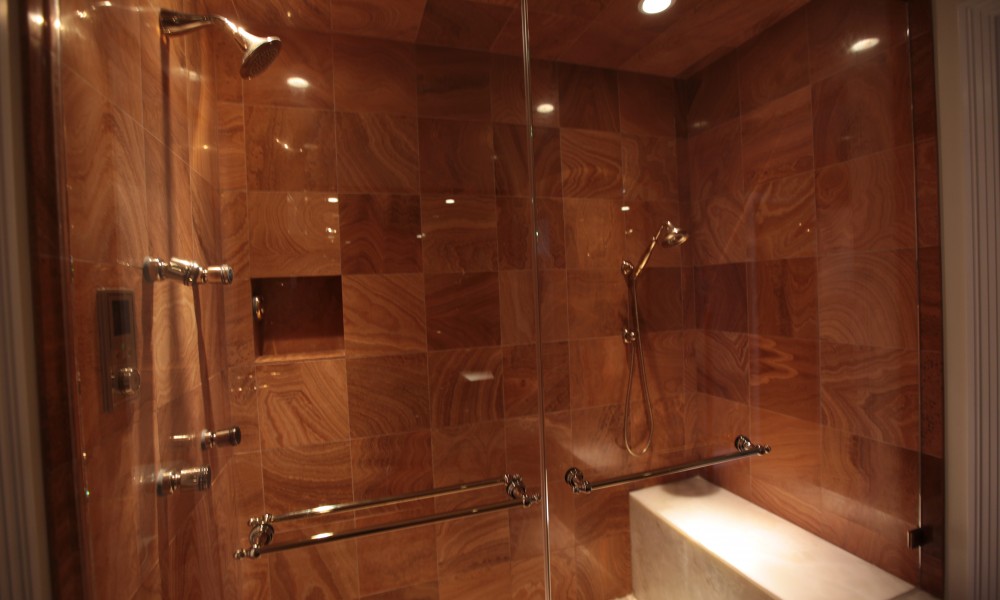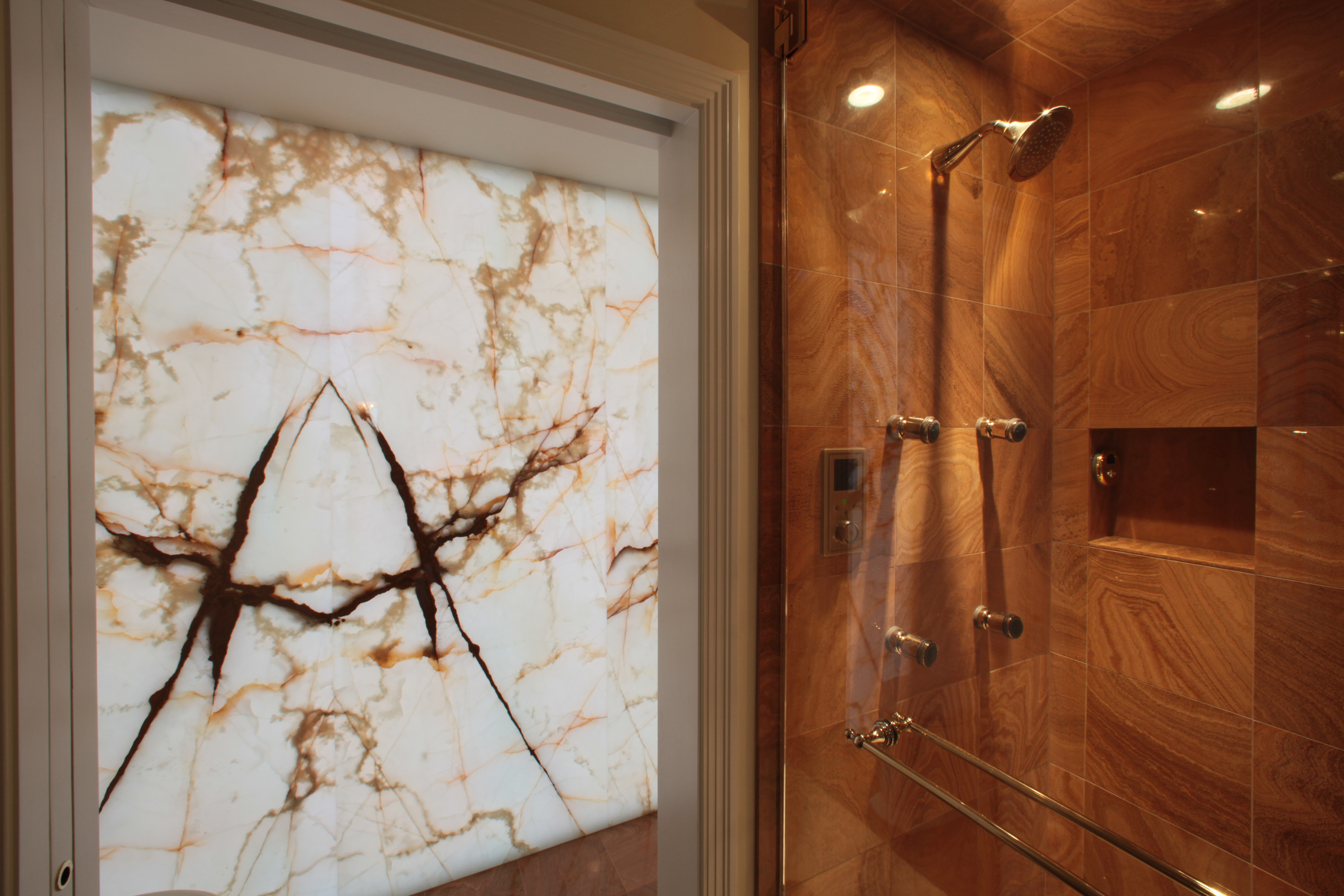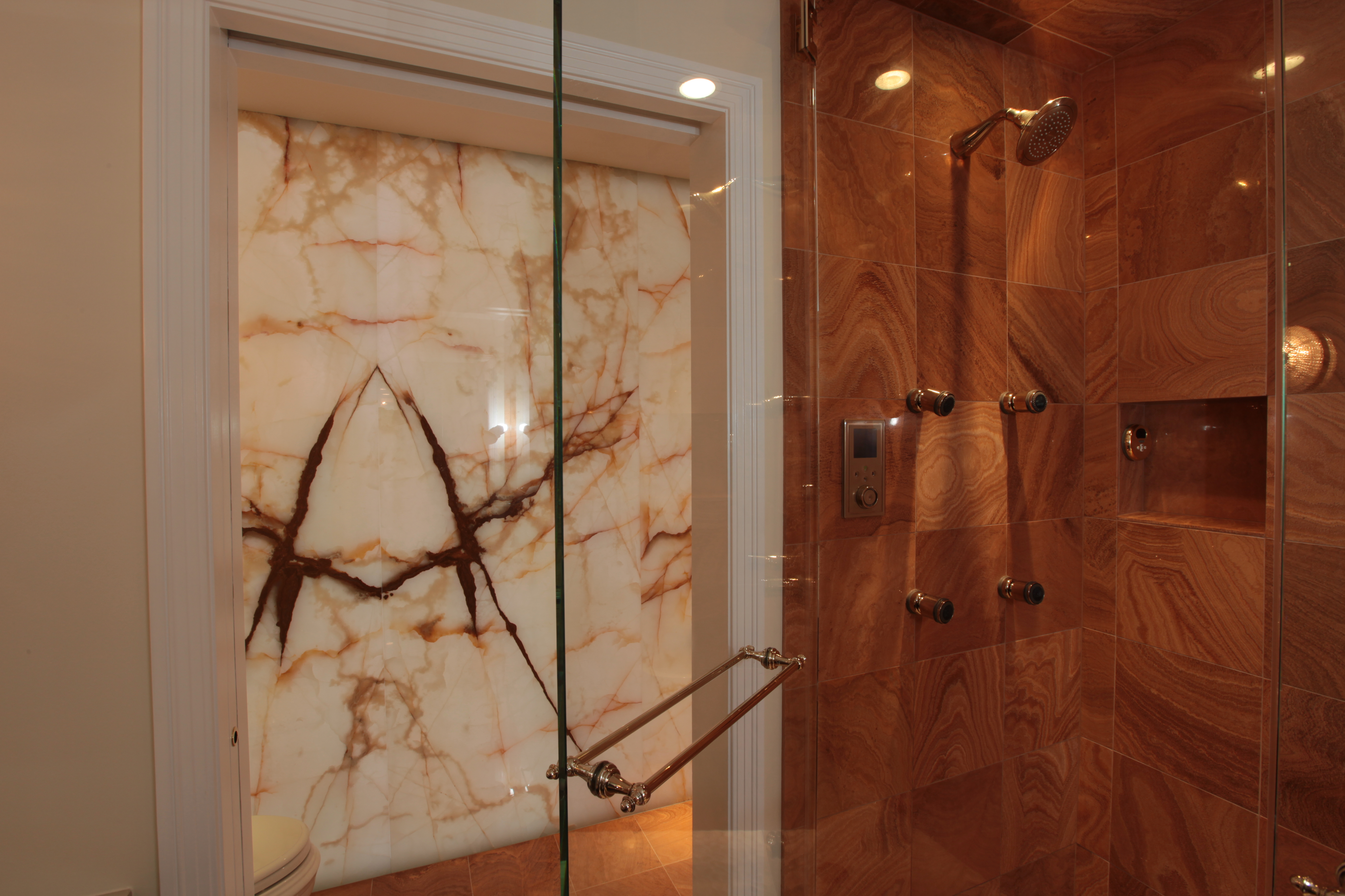 The Master Bath Suite was reconfigured to include a water closet for a toilet, bidet and a state-of-the-art Kohler DTV shower system with rain heads, body sprays and steam with custom-mounted controls. Incorporating an innovative lighting solution, the new suite is highlighted by a custom-designed back-lit green onyx wall.