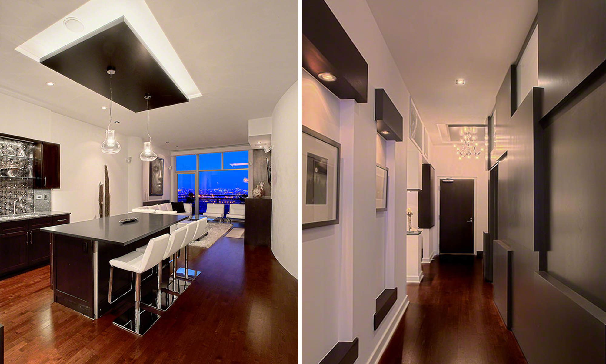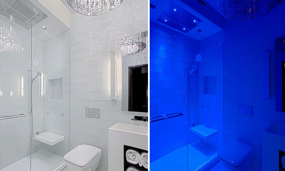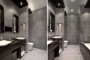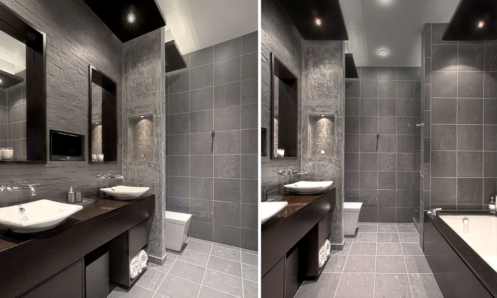 The team fostered a bathroom design with a spa-like feel that was inspired by The Hotel in Las Vegas. To maximize an open-flowing space, the ceiling was vaulted 2 feet. Increasing the ceiling height presented a challenge: the fire sprinkler, which was set for the previous ceiling height, needed to be relocated. Working with the building property manager, Centaur received approval from the building architect for the relocation. Custom recessed lights accentuate the ceiling, giving the allusion the dark wood panels are floating from the ceiling. This feature allows both direct and indirect lighting.