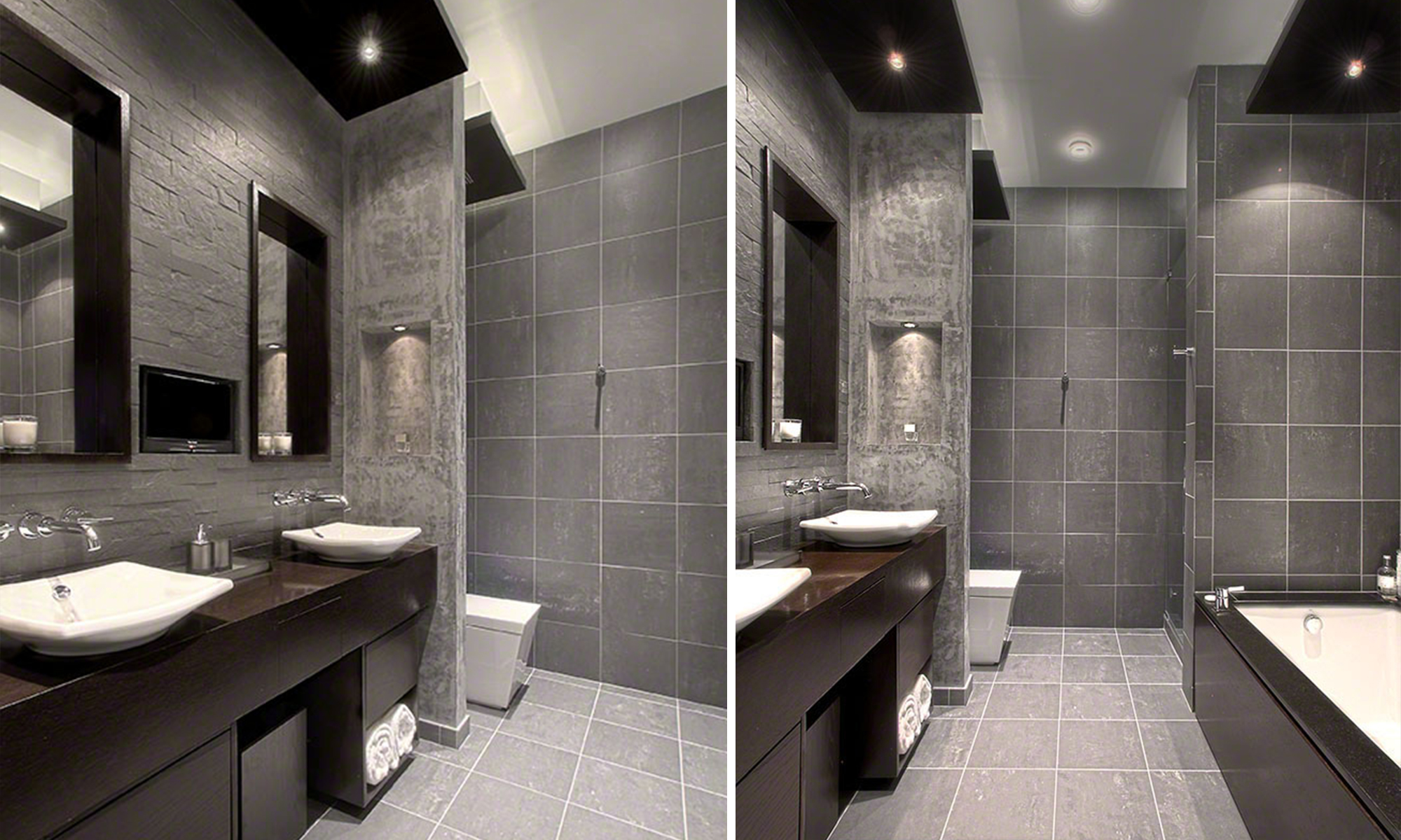 Vessel sinks, in-wall faucets, mirrors and lighting are centered, providing an artistic, yet meticulous appearance. A TV is recessed within the stone and visible from many viewing points. The Kohler Water Tile Rain Shower seems to float, enhancing the spa experience.